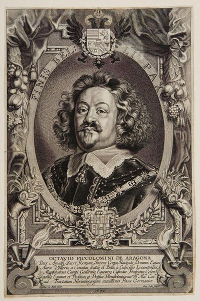 Curator: Here we have "Georgius Ubricus comes to Wolckenstein and Rodeneg," a captivating print by Cornelis Galle the Younger. Editor: It has such a somber feel, doesn't it? Very stately and severe, like a royal decree etched in time. Curator: Indeed. Note how Galle uses the oval frame and heraldic symbols to create a rigid structure. The inscription, which encircles the portrait, also reinforces the formal composition. Editor: But the man himself, Georgius Ubricus, has such a knowing look in his eyes. It’s as if he knows the weight of all those titles, of being a Count and Imperial Legate, but also finds it all a bit… absurd? Curator: An interesting reading! The contrast between the subject's potential inner world and the rigid formality of the composition is precisely what makes this print so compelling. Editor: Well, Cornelis Galle the Younger certainly captured a world of both duty and irony in this image. Curator: Precisely, and one where meaning is found in the structural relationships of the composition.
