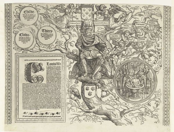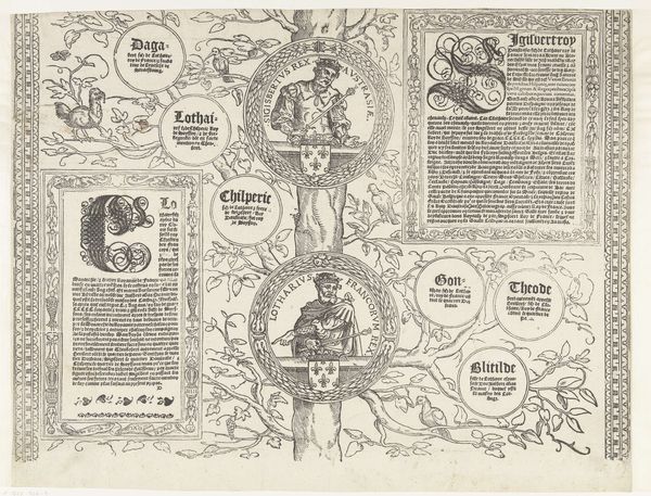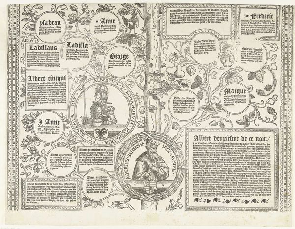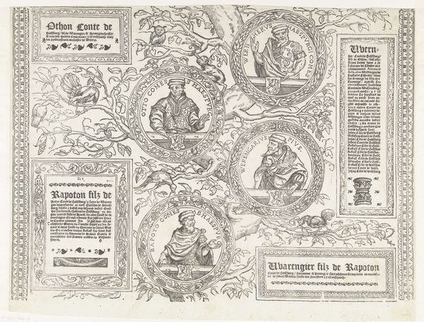 Curator: Here we have "Stamboom van het Habsburgse huis, blad vijftien," a work made with ink, paper, and engraving, dating from 1533 to 1535, courtesy of Robert Péril. Looking at it, the first word that comes to mind is 'dense.' It's as if the artist packed every available space with image or text. Editor: Yes, it does possess that wonderful claustrophobia of information that medieval images often have! Beyond the pure visual density, what strikes me are the family portraits nestled within what seems a symbolic forest, each face hinting at dynastic ambition and carefully constructed lineage. Curator: Indeed! It really feels like a complex diagram rather than just a portrait gallery. See how each name is enclosed within a different decorative style, almost like a badge or heraldic emblem? Editor: Precisely. Each framed portrait acts as a mnemonic device. Consider the selection of emblems surrounding them, subtly revealing a matrix of political associations and inherited rights, perhaps even suppressed conflicts bubbling beneath the surface of officialdom. Curator: So you are pointing to those tiny decorative elements? Those hearts? Or maybe something in that little tower, representing some geographical claim? Editor: Possibly both, plus anything else. That kind of embedded imagery had so much power then, precisely because they worked on different levels of awareness, something like the background narratives that follow celebrities today. Curator: It’s strange to think of history being propagated like that—layered with imagery so dense it risks being overlooked today! Editor: And that contrast is what keeps it vibrant and alive now! It whispers to us about its hidden grammar, allowing new eyes to unlock the original stories within, revealing patterns that were once glaringly obvious but now beautifully mysterious. It is visual code waiting to be cracked! Curator: Yes, visual code that has seen empires rise and fall, families change their faces and ideologies adapt to the shifting sands of history. That makes for some potent reading indeed.