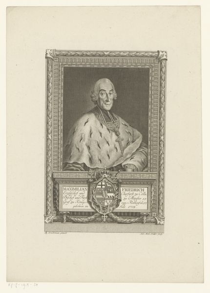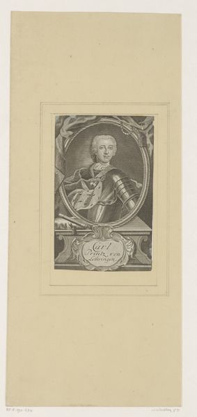 Johann Michael Söckler created this portrait of Maximilian Joseph III of Bavaria using etching and engraving techniques. The piece offers a glimpse into the constructs of power and identity in 18th-century Bavaria. Maximilian Joseph III is presented within an ornate oval frame, adorned with symbols of status, reinforcing his position. The armor and royal regalia suggest a ruler concerned with maintaining authority and projecting an image of strength. Yet, the soft rendering of his face hints at the human being beneath the crown, someone who also navigated the complexities of identity and expectation. Consider the emotional weight carried by such representation, both for the subject and the audience. Söckler's portrait provides a look at the visual strategies used to affirm social hierarchies. It also brings forth questions about how individuals negotiate their identities within the structures of power.