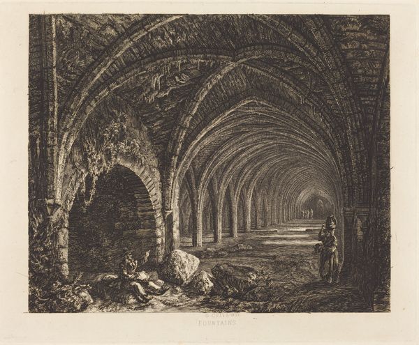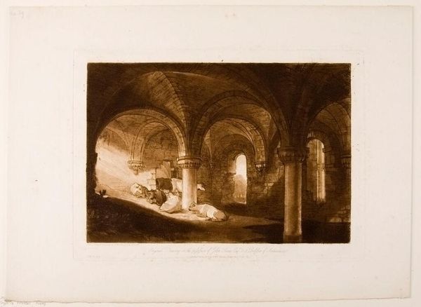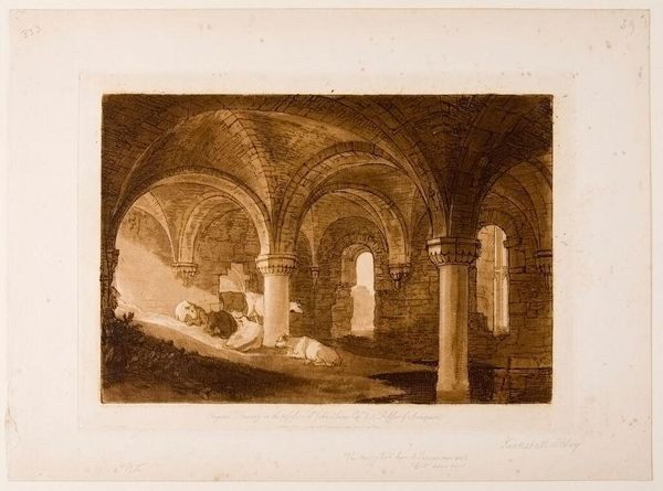 This print of Kirkstall Abbey's crypt was created by J.M.W. Turner, using etching and mezzotint. Etching is the use of acid to cut into the metal, and mezzotint involves roughening the surface for tonal effects. These processes are less immediate than painting or drawing, but are extremely well-suited to capturing light and atmosphere. Here, the light seeps into the ruined abbey in an almost palpable way, illuminating the rough stonework and the livestock seeking shelter within. Turner made his own paper, mixed his own inks, and burnished the plates himself, giving him complete control over the final image. These hand processes stand in contrast to the industrialization happening at this time in England, with machines and factories transforming the landscape. By returning to the hand and depicting a scene of pre-industrial life, Turner offers a subtle commentary on the changing world, reminding us of the value of traditional craft and rural existence.