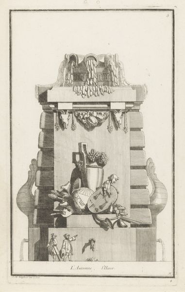 Curator: Let's discuss this print titled "Fontein met dolfijnen," or "Fountain with Dolphins," an engraving crafted sometime after 1771, and currently held here at the Rijksmuseum. Editor: Well, first glance, it gives me the distinct feeling of an ornate invitation. There's something celebratory and theatrical about the composition. It’s balanced yet brimming with symbolic overload—I mean, what does it all mean? Curator: Its Baroque sensibility shines through. Look closely at the organizational structure; the print establishes a clear hierarchy with the fountain as its base. Observe the meticulously rendered garlands and tassels and how the various objects atop the structure guide our sight toward specific details. Editor: Ah, I see what you mean. All eyes go to that cluster on the very top of the pediment, doesn't it? Books, art supplies, flowers, wheat—it’s as though all of human creativity is piled there. What could it signify? Knowledge, art, nature's bounty perhaps? It’s a still life but for an allegorical god of the fine arts! Curator: The objects can be understood as representational indexes of human cultivation. The dolphins, on the other hand, inject an element of the untamed. Editor: Indeed! It’s as if the artist, or designer, set up these very rigid and civilized forms, and then injected chaos in the most enchanting of ways with these water mammals, leaping playfully. What about the function of a print like this? Was this a design proposal of sorts, or perhaps part of a series? Curator: Exactly. This piece might have functioned as part of a catalog of decorative designs, meant to inspire wealthy patrons commissioning fountains for their estates. It displays artistic ingenuity alongside technical mastery, providing insight into 18th-century aesthetic ideals. Editor: To think that this engraving, precise as it is, once fueled someone's extravagant vision—it bridges time, doesn’t it? Curator: Precisely. It provides access to both material culture and the philosophical spirit of its time.