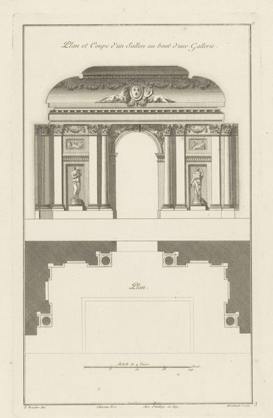 Curator: We're now looking at "Design for a Facade," a drawing by Pietro Paolo Coccetti from around 1710 to 1727. It's currently held at the Metropolitan Museum of Art. What's your first impression? Editor: Stark. Terribly sparse, isn't it? All I see are lines struggling to become something substantial. What materials were typically employed in structures like this? Curator: Functionally, it operates within established Renaissance architectural principles. The clear, concise lines speak volumes about the conceptual purity the artist was striving for, revealing his meticulous attention to geometric structure. Look at the implied depth achieved with such economical means. Editor: But depth without the weight of actual material seems…hollow. One wonders about the hands that would transform these lines into stone. About the laborers, their working conditions. Who profits from the construction, what purposes does the finished building serve? All obscured, isn't it, by this decontextualized depiction? Curator: But to become enmeshed solely within such considerations would diminish the compositional balance. The calculated interplay between voids and solids guides the eye purposefully. Notice how the unadorned surfaces throw the linear patterns into high relief. It is less an anticipation of practical labor and more a celebration of abstract perfection. Editor: Still, how does the materiality, or lack thereof in the drawing itself, affect its perceived value? This meticulous plan speaks volumes, sure. But plans on paper meant nothing without human exertion to turn them into inhabitable space. So, in turn, where's the emphasis here? Design detached from execution. Curator: Coccetti offers a study in the architecture of thought, revealing the intrinsic order of design that will later materialize into lived space. Editor: Yes, thought abstracted, filtered by the privilege to conceive such geometries, but missing, to my eye, that crucial grounding in physical realities. Curator: A potent tension, perhaps, between conceptual ideation and tactile implementation, allowing us to consider just that. Editor: Exactly. Maybe these drawings weren't quite meant for the masons' hands, but the patron's mind.