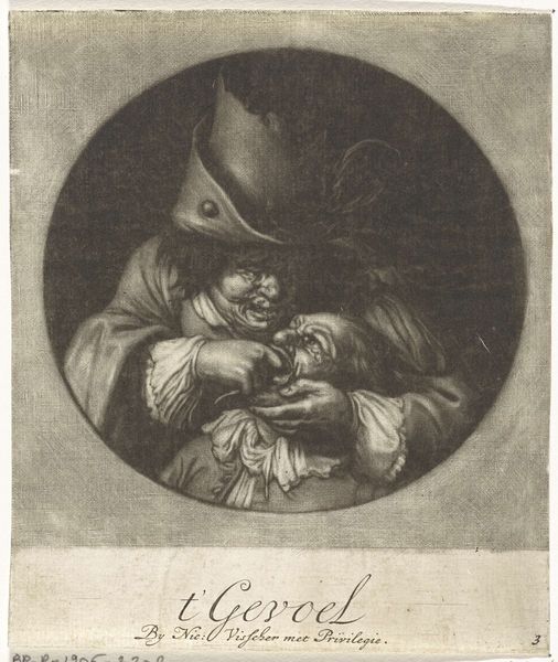 Jacob Gole created this piece, entitled "Ongewenste Omhelzing," using an engraving technique. The figures, an unwelcome suitor and his target, are arranged in a circular composition, a familiar structure harking back to Renaissance portraiture. But what can we say about the man’s hat and collar? These are visual signifiers of class and, perhaps, pretension. They connect to a longer history of attire signaling social status. Think of the ruffs in Dutch Golden Age paintings, each fold speaking to wealth and meticulous self-presentation. Yet, here, the attire seems almost parodic, hinting at a deeper mockery of social climbing and moral hypocrisy. The gesture of the woman turning away has been a long-standing symbol of rejection, and you can see that across time from classical sculpture to modern photography. The emotional tension in her posture evokes a powerful, almost visceral response, tapping into our shared, subconscious understanding of discomfort and resistance. It appears and reappears across time, evolving with each telling, its underlying essence resonating across centuries.
