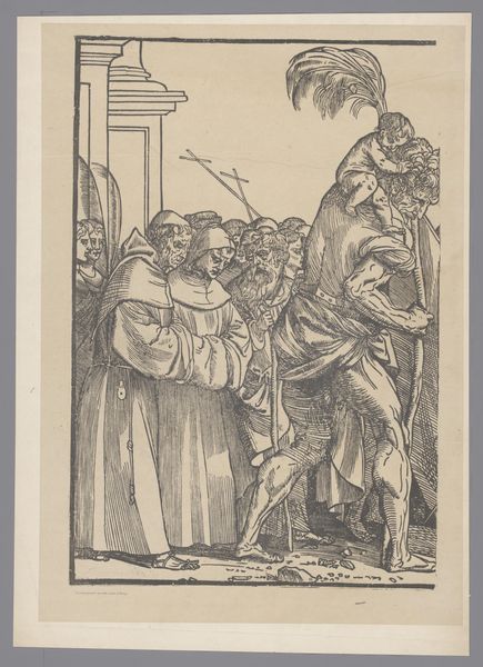 Curator: Ah, "Section H: Saint Christopher carrying the Christ Child, from 'The Triumph of Christ'", an engraving rendered around 1836 by Andrea Andreani, now residing here at the Metropolitan Museum. Editor: Whoa, talk about a heavy burden. Immediately I sense a powerful myth playing out here, etched in such stark lines and shading. Curator: Indeed. Note the visual dichotomy created by the contrasting musculature of Saint Christopher versus the almost saccharine depiction of the Christ Child. It evokes a sophisticated understanding of Renaissance humanism. Editor: Sophisticated, yes, but the mood also strikes me as… I don’t know, burdened. The weight feels palpable in every line. The way everyone is looking down as Saint Christopher is walking. He looks almost angry at the kid, who looks perfectly cheerful as though this is his favorite pony ride. Curator: The linearity and the absence of color guide our perception, emphasizing form and narrative. We must recognize how Andrea Andreani manipulated line to guide the eye and construct meaning from a potentially disorganized composition of several figures. Editor: Absolutely! It feels like this old story is just echoing something ancient. Even today, who hasn't carried a load—maybe not a divine one—but felt every ache and step of the way? The expressions are brilliant; they convey everything the scene tries to portray. You can see that everyone around them understands the sacrifice. Curator: The print exemplifies the characteristics of Northern Renaissance art, bridging late medieval sensibilities with emergent humanist ideals. Also, let's observe the materiality, specifically Andreani’s usage of woodcut alongside engraving which presents tonal contrasts. Editor: To me, art becomes incredible when it transcends technique and connects with those basic human feelings. Seeing a burdened Saint Christopher reminds me that nobody is alone. We are constantly reminded by one another of our strength. Even on days when our backs feel like they’re going to give. It is reassuring in the end. Curator: A nuanced observation. A final word might dwell on Andreani’s successful portrayal of divine struggle and human endurance; he evokes theological depth in his work that goes well beyond mere representation. Editor: It's definitely one of those artworks that resonates long after you've left the room. Its simplicity speaks loudly.