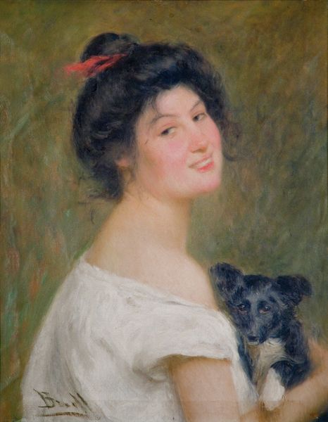 Curator: Here we have Rupert Bunny’s "Portrait of the artist's wife," an oil on canvas from 1902. It’s a genre painting that really captures the aesthetics of its time. Editor: The first thing that strikes me is the subject's gaze—almost challenging, isn't it? And that delicate yet palpable contrast between her elegant attire and the realism of the brushstrokes. Curator: Indeed. Consider the construction: we have oil paints laid on with visible, directional strokes and glazes, typical of Impressionism yet refined within the traditional genre of portraiture. Bunny was experimenting with how labor could produce 'high art'. Editor: And beyond the materials, look at the symbolism. A woman of her time with her dog: a symbol of fidelity, wealth, and status. This pet adds another layer of complexity—it suggests a softer, more domestic side contrasted with her composed exterior. Curator: Good point. The textures give us further clues about its creation. The hat's lace, her striped dress and the way light plays across the surface speak of contemporary fashions of industrialised textile manufacture in Europe and the possibilities for visual dynamism and display it gave painters like Bunny. Editor: I see also that the artist is creating a complex language of femininity, innocence, and knowing worldliness all interwoven. It makes us ponder how women in art were starting to define themselves outside traditional archetypes at the turn of the century. Curator: Absolutely. This work brings to mind an important consideration when examining art of this era: the burgeoning consumer market alongside the artist’s creative agency within it. Were portraitists like Bunny merely documenting society, or helping shape a shared visual culture? Editor: What a beautiful conundrum—are images simply mirrors reflecting reality, or instruments that shape it? I now read in the brushstrokes echoes of personal intention and, perhaps, hints of longing. Curator: Agreed. Appreciating art means also accounting for the historical labor and technologies informing an artist's vision, in addition to the symbolic weight behind the subjects, or compositions of their chosen theme. Editor: I find myself drawn to the way Bunny managed to compress and translate a myriad of social and personal references with so few visual cues. It truly speaks to the lasting potency of symbols across generations.