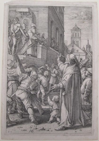 Editor: This is Jacques Callot's "Ecce Homo," a 17th-century engraving. The scene is incredibly detailed, with a palpable sense of tension in the crowd. What strikes you most about this piece? Curator: Beyond the immediate religious narrative, I see a potent commentary on power and the spectacle of injustice. Consider how Callot frames the crowd's complicity, their baying for blood mirroring societal structures that perpetuate oppression. Where does individual responsibility lie within collective action? Editor: That's a powerful point. It makes you think about contemporary issues like mob mentality online. Curator: Precisely. The historical context informs our present. By examining how Callot depicted these power dynamics, we can gain a deeper understanding of our own roles within societal systems. Is justice truly blind, or is it selectively applied? Editor: I never thought about it like that before. Thanks for sharing. Curator: Likewise. It is important for us to see art as a lens through which we examine power, complicity, and social justice.