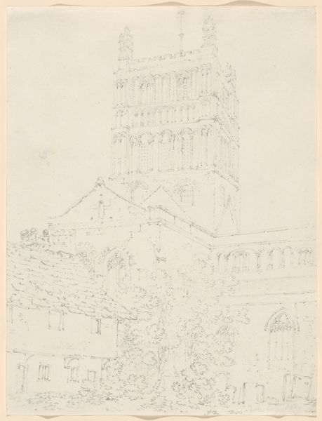 Curator: Charles Rochussen’s drawing, “Lakenhal te Yperen,” places us in Ypres, sometime between 1824 and 1894, immortalizing its iconic Cloth Hall in graphite. Editor: It's striking how Rochussen renders this imposing structure with such delicate lines. There's an almost dreamlike quality to the lightness of the graphite. Curator: The Cloth Hall, of course, was more than just a pretty building. It represented the economic power of Ypres, a hub of the medieval textile trade. Rochussen created this architectural drawing amidst a period of intense political and social change, and, given that historical context, his emphasis on the traditional seat of governance makes it into a strong statement about shifting power dynamics. Editor: The very precise detailing and architectural accuracy—the rhythm of the Gothic arches, the towering belfry—speaks to a profound interest in structure, in laying bare the organizational logic of the building itself. Semiotically, the drawing itself is a statement about rational organization. Curator: Absolutely, but look closer: he's populated the scene with ordinary people. Merchants, families, soldiers. The work then presents the viewer with multiple perspectives, from different levels of society. Their inclusion complicates any simple reading of power; their very presence asserts their claim to the city, the space that has historically excluded them. Editor: That layering of detail, particularly in the facade, generates an optical complexity that pushes the eye deep into the composition. There is very little tone here; it is as though light itself were an organizing principle. Curator: Ultimately, this seemingly straightforward architectural study offers a nuanced vision. Rochussen seems acutely aware of the evolving social and political landscape of his time, and captures the spirit of a town steeped in history, standing at a precipice of modernity. Editor: Precisely. Rochussen’s command over line and perspective transforms the Cloth Hall from a mere architectural subject into an emblem of human endeavor and aspiration.
