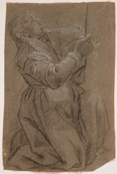 Curator: This intriguing drawing, rendered in pencil, is entitled *Mannelijke figuur in toga,* or *Male Figure in a Toga*, attributed to Eustache Lesueur, created sometime between 1627 and 1655. Editor: There's a captivating simplicity here. The soft reddish-brown pencil lines evoke a sense of classical antiquity, but there's also a compelling rawness. The figure feels monumental, even in this fragmentary state. Curator: Absolutely. Consider the socio-political context in which Lesueur was working. France in the 17th century was heavily invested in notions of grandeur, of empire. This drawing speaks to those aspirations, evoking the power of Roman statuary but with a distinct French sensibility. Editor: It’s a complex dance of power dynamics too. Who was granted the privilege of representation? How does this idealized, masculine form function as propaganda, normalizing certain bodies while othering others? We see the seeds of colonialism and patriarchal structures being sown here. Curator: The art world and the political echelons of the time were entwined, as they still are today. This kind of academic art, highly realistic, was supported by powerful institutions. Lesueur was creating for a very specific audience with a clear message of control. Editor: Yet, there's something almost vulnerable about this drawing. The incompleteness allows us to project our own interpretations, question the constructed nature of the ideal, and consider what’s been omitted, whether intentionally or not. Perhaps we can engage in a dialogue, bridging the gap between Lesueur’s historical world and the concerns of today. Curator: Indeed. This single drawing, so full of historical echoes, urges us to continue exploring the ways art shapes and is shaped by power. Editor: It's a reminder of how images both reflect and perpetuate systems, offering insight into historical values while prompting ongoing scrutiny.