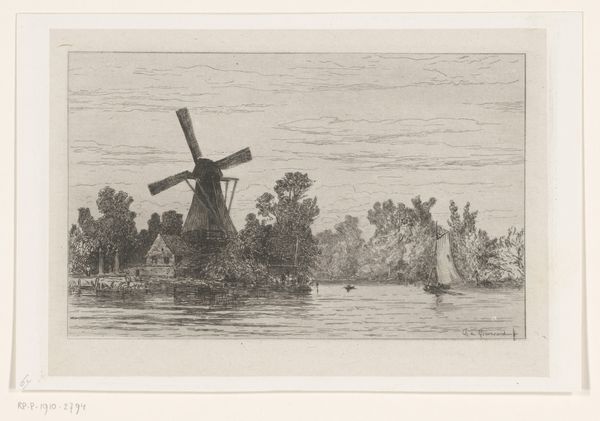 Curator: So peaceful. The light is really captivating in Elias Stark’s etching, “Landscape with Two Windmills and a Rowing Boat” from 1886. It's part of the Rijksmuseum collection, a lovely example of Dutch landscape printmaking. Editor: Serene, yes, almost melancholic. It gives me a quiet sort of loneliness... like that rower out there is the only soul left on Earth. Is it the lack of vibrant colors perhaps, just the muted blacks and whites? Curator: The etching technique really lends itself to that mood. It reminds us how dependent people were on nature, on the winds powering those mills, their livelihoods intimately tied to it. I think it invites reflection on the pre-industrial relationship with land, perhaps hinting at environmental concerns. Editor: Absolutely. Those windmills become almost like figures in the landscape, watching over everything. And the reflection on the water makes everything blurry; real, but intangible too, a memory maybe? Plus, you know how I love reflections... I can lose myself staring at water and its echoes! Curator: It certainly resonates with themes of labor and our relationship to the natural world, questions so relevant to current discussions around climate change and sustainable practices. Editor: And don't forget, windmills also symbolize progress, moving forward, right? Maybe it’s about embracing technology within nature, seeing humans as part of it rather than against it? Although that little boat seems to go backwards, interesting perspective. Curator: It’s complex isn’t it? A dance between past and future, technology and environment. Stark layers meaning through careful detail. Editor: It really got me thinking about resilience and balance, human impact and how fragile our position really is within the bigger picture... art's greatest power, in my opinion! Curator: It truly makes you consider our footprint on the Earth, and how landscapes have historically been a site of work, and a barometer of social change. A powerful piece in its simplicity, and speaks volumes today. Editor: Exactly. I’m gonna leave here contemplating how many boats have sailed those imaginary waters of my mind in the meantime! Good food for thought, thanks for guiding me today.