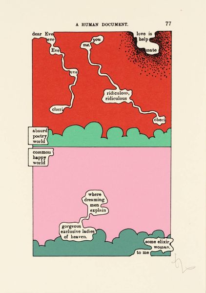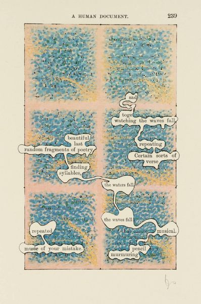 Editor: This is a print from an artist known as Esq Tom Phillips. It's called "[no title: p. 36]" and is held at the Tate. It has this almost dreamlike quality, with words floating in soft green blobs against a pink background. What do you make of it? Curator: Dreamlike indeed, or maybe even like peering into someone's mind. The isolated words—"lamp, disturbance," "hidden, niece"—feel like fragments of thoughts, don't they? Phillips often uses found texts, altering them to create new meanings. It's a bit like subconscious poetry. What do you think the pink and green contribute? Editor: Maybe a sense of calm? It’s interesting how those colours make me feel even though the words themselves suggest a sense of disturbance. Curator: Precisely! It is a testament to how colour and form can both contradict and amplify meaning. It’s a fascinating push and pull, isn’t it?