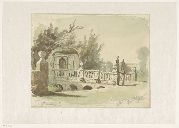 Curator: Let’s spend some time with Jan Striening's "Ruïne van het slot van Heemstede," created between 1865 and 1869. What are your initial thoughts? Editor: There’s a melancholic atmosphere to it. The subdued watercolor palette and the dilapidated structure evoke a sense of faded grandeur and perhaps, the transience of power. Curator: Precisely. Striening, working within the Romanticism style, uses watercolor to great effect. Note the gradations in tone – see how the light catches on the ruin. Consider too, watercolor's accessibility. Its association with sketching and travel denotes the experience of viewing and making landscape a process embedded in larger imperialist patterns. Editor: That contextualization is key. Ruins are never just stones; they're laden with social meaning. The crumbling castle could represent anxieties surrounding class structures of the time, the obsolescence of aristocracy amidst rising industrialism and the power of capitalism. Curator: And the watercolor medium further enhances that point. Watercolor production differs greatly from oil in both skill and accessibility, thereby complicating notions of 'high' and 'low' art making. The artist chooses the soft medium specifically because it stands in stark contrast to both the subject, and the other, dominant material means through which we traditionally understand painting. Editor: The overgrowth of nature around the ruin also interests me. It seems nature is reclaiming what was once strictly delineated as "culture." It's almost a visual representation of postcolonial critique, where marginalized forces slowly erode the symbols of former dominion. Curator: Very insightful. Striening also emphasizes the sheer volume of material needed to construct castles and aristocratic wealth. Think about the people who would have labored to construct this building. Consider how that labour is rendered in delicate strokes. Editor: It also feels relevant to contemporary discussions around the preservation and the ethics around resurrecting these ruined structures. Who benefits, and whose narratives are centered? Curator: I concur. This work certainly holds layers that unfold with time, prompting one to delve deeper into socioeconomic concerns while interrogating its materiality. Editor: Definitely a thought-provoking piece that makes us question what and how we remember. Thanks for walking us through it.