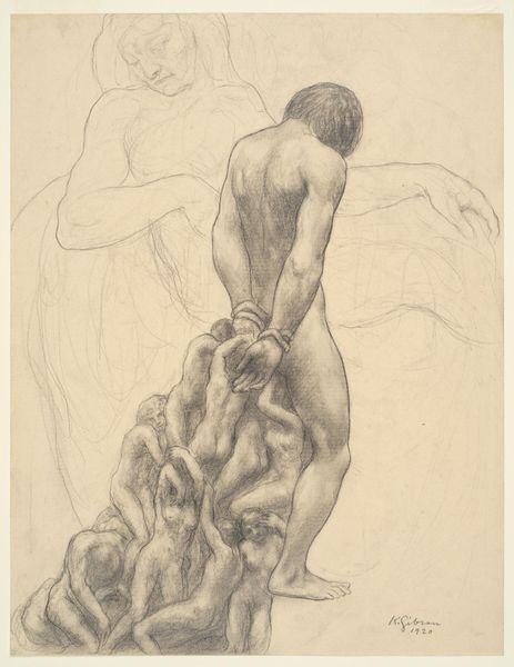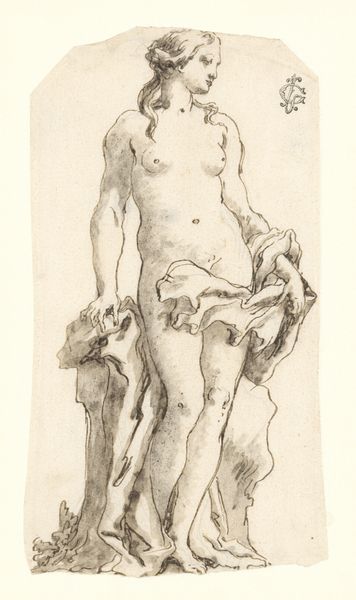 Editor: Here we have William Etty’s "Bacchante," an ink and pencil drawing from the first half of the 19th century. It's so dynamic; the figures almost leap off the page. I’m really curious about what’s going on here… what do you see? Curator: I see a deliberate connection to antiquity, reaching for archetypes to express something deeply human about ecstasy and liberation. Consider the Bacchante herself. She’s an image steeped in cultural memory, harking back to Dionysian rituals and the intoxicating abandonment of social constraints. What does the tambourine suggest to you? Editor: Maybe rhythm, celebration? A frenzied state of mind? Curator: Precisely. The tambourine and the figures—the bacchante and the child playing—are potent symbols, each layering meaning onto the other. Look at their gestures; what feelings do they evoke? Editor: A feeling of uninhibited joy, perhaps, but also a certain wildness...almost a loss of control. Curator: Indeed! Etty uses the Bacchante, an enduring archetype, to explore the push and pull between order and chaos, reason and instinct—tensions that resonate across time. Do you notice anything about the figures in the background? Editor: Yes, they seem more subdued, watching the bacchante...are they separate from the central action somehow? Curator: They might represent a contrasting viewpoint to the ecstatic dance in the foreground: restraint versus revelry. Art becomes a language of symbols when referencing existing iconography, reflecting how artists speak to each other over generations. It is exciting how it reflects cultural continuity. Editor: That’s a fascinating perspective! I never really considered how an image could be a vessel for all this history and cultural significance. It’s given me a new appreciation for the power of symbolism in art. Curator: Agreed, by exploring these cultural throughlines, we deepen our understanding of ourselves and our place within history.