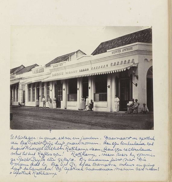 Curator: Good morning, welcome. Today, we are looking at "Stads Herberg & kleine Boom" taken between 1863 and 1866. It is an albumen print. The photographers are Woodbury & Page, and it is currently held in the collection of the Rijksmuseum. Editor: There is a stark stillness to this street, despite being what looks to be a public space. The architecture hints at order, a very precise way of life. It also looks almost theatrical with the portico like something on a film set. Curator: I’m struck by the daguerreotype process here. Imagine the labour involved, from preparing the plates to the exposure time. And then the transport and distribution of these delicate images. What does that tell us about its accessibility in society? Editor: This thoroughfare serves as a central axis, leading the eye into the distance. The pillars evoke classical antiquity, speaking to an order imposed by colonial structures. A powerful cultural statement through the image. Curator: Exactly! Colonialism relies on both material extraction and visual dominance. Photography was instrumental in crafting and disseminating an idealized image of control. Every print becomes an instrument of social order and reinforces hierarchies. The act of production itself becomes politically charged. Editor: I find it haunting. The play of light and shadow creates a dreamlike quality that lingers, forcing me to confront a cultural memory of unequal encounter. It carries with it the silent weight of that time. Curator: It prompts us to question the romantic view of progress that photography was meant to portray. We have to delve into the materials used, their origins, the colonial enterprise. By examining it from production to reception, a daguerreotype challenges this very notion. Editor: Thank you. This has broadened my perspective, revealing the interplay of visibility and the unseen, echoing how certain narratives are prioritized over others. Curator: And hopefully, it has allowed us to rethink the consumption of these visual objects in the 21st century. Thank you.