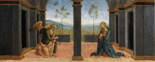 Pietro Perugino painted this panel, ‘Adoration of the Shepherds’, as part of an altarpiece likely sometime in the late 15th century. Observe the Holy Family beneath a delicate loggia, flanked by adoring shepherds, and hovering angels. The symbol of the angels, common in Christian iconography, has roots stretching back to ancient Mesopotamian and Persian art, where winged figures acted as divine messengers. Over time, these figures were integrated into the Christian tradition as intermediaries between God and humanity. Here, they're imbued with Renaissance grace, yet their core function remains. The shepherds, too, echo an ancient theme – the humble paying homage to the divine. Think of the Roman emperor cult, where conquered peoples offer tribute, transformed here into a heartfelt, pastoral devotion. Such recurring motifs speak to the enduring human need for connection with something greater. This adoration scene speaks to collective memory, triggering deep emotional responses to hope and faith. These symbols didn't vanish after the Renaissance; they resurface, evolving, in later works, proving that images never truly die.