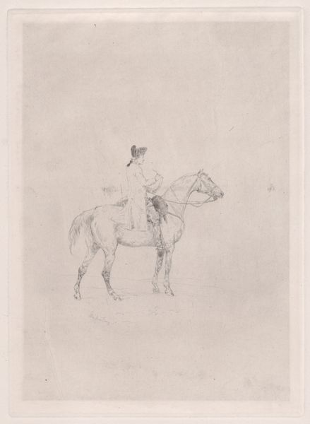 Curator: Edgar Degas, most famously known for his ballerinas, also dedicated significant time to exploring the theme of horse racing. Here's a pencil sketch, "Horse and Rider," from around 1887-1890. It resides here at the Art Institute of Chicago. Editor: It's a fascinatingly swift work, isn’t it? I can almost feel the paper’s tooth grabbing at the pencil, a deliberate roughness. The ghostly rider contrasts with the defined body of the horse, suggesting fleeting social privilege supported by real material labor. Curator: Precisely! It is almost like a ghost haunting the work of those lower than it in life, and you zero in on Degas' use of pencil. Think of it as industrial graphite meets animal and aristocratic muscle. It highlights his masterful touch with layering and shading to bring out musculature and form, but then fades almost to nothing on the jockey. Editor: I wonder what paper he used. Its grade and source would tell us so much about Degas' working method, his access, his relationship to industrial production and commerce—it really does place Degas and this scene within the networks of 19th-century commodity exchange and leisure. The pencil strokes, the hatching: It all emphasizes process as a type of labor captured in aesthetic form. Curator: I’m absolutely onboard. The hazy etching provides almost an element of movement. The energy! As an Impressionist, Degas wanted to catch that immediacy. I think he wasn’t merely representing, but actually, re-experiencing and conveying that specific moment. He wants us to understand it with him, but through feeling, a type of personal vision. Editor: It's an ambivalent feeling, though, right? There's admiration for the form and potential of labor power contained in both human and animal bodies, certainly, but is he aware of the economics of this “sport,” and of this depiction? Did he truly interrogate this relationship? It’s a picture of privilege made from base materials – which is how capitalism worked, then and now. Curator: Yes, and thank you for grounding us! "Horse and Rider" shows that Degas was definitely more than the pastel-swirling poet of ballet dancers that many assume he was. This drawing also serves as evidence of how materials themselves are deeply entwined within culture, labor, and the spirit. Editor: Exactly. Thinking about the social and material dimensions really deepens our understanding.