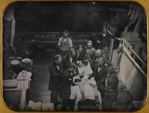Editor: So, this haunting image, "Untitled (Demonstration of the Surgical Use of Ether)," attributed to Southworth & Hawes, shows a surgical scene. It feels so staged, so… formal. What do you see in this piece? Curator: It's a capture of a pivotal moment, isn't it? The advent of ether's use in surgery. Forget antiseptic! Imagine the horror of surgery before this. I think that the composition, carefully arranged, speaks to a desire to frame this moment as progress. Editor: Progress, but it also feels… clinical, detached. Curator: Detachment was part of the ethos of the time. Science as objective, clinical. A way of distancing oneself from the realities of the body. Editor: It’s fascinating how much a single image can reveal. Curator: Indeed. A moment framed in time, a question for us to ponder.