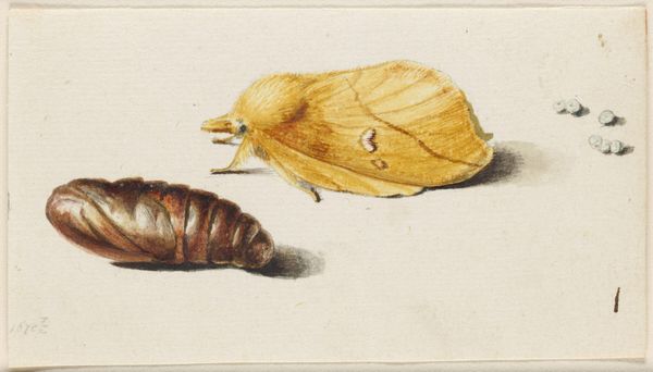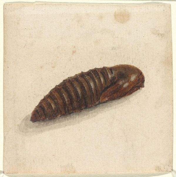 Editor: This is "A Caterpillar," a watercolor and print by Vincent Laurensz van der Vinne, dating back to sometime between 1650 and 1702. There's something so delicately rendered about it; it’s almost photographic in its detail. How do you interpret this work, beyond just a scientific illustration? Curator: Indeed, it invites a reading beyond straightforward naturalism. Think about the caterpillar itself – what does it represent? It’s a symbol pregnant with meaning across cultures. Transformation, of course, is primary. From earthly crawler to soaring butterfly. In some contexts, the caterpillar is a potent symbol of potential and resilience. What feelings does it stir in you? Editor: Well, now that you mention it, I initially saw something almost grotesque, but the coloring, the detail... it hints at the beauty *within* that transformative process, like a hidden promise. Do you think van der Vinne was conscious of these broader associations? Curator: It's hard to say definitively, but it would be unusual if an artist working in the Dutch Golden Age, surrounded by still lifes brimming with symbolic meaning, was *unaware* of the cultural weight of depicting such a creature. Furthermore, insects at that time were often seen as emblems of mortality and the ephemeral nature of life, memento mori. Editor: So the caterpillar is not just a caterpillar; it's a carefully chosen symbol meant to evoke themes of change, life cycles, and maybe even the fleeting nature of beauty itself. Curator: Precisely. The artist coveys mortality with great beauty. It is something worth pondering. Editor: I see the image in a different light now. What began as a naturalistic study transforms into something profound. Thank you.
