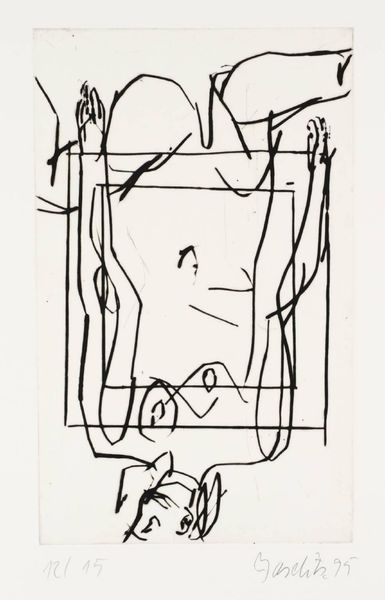 Editor: Here we have an untitled print by Georg Baselitz from 1995. The stark black lines on the white paper create a chaotic sort of feeling. How do you interpret this interplay of line and form? Curator: Note the artist's deliberate use of disjunctive lines. The composition defies traditional perspective, challenging our perception. Do you find a coherent structure beneath this seeming chaos? Editor: I see figures, maybe? But they're distorted and upside down. Is that intentional? Curator: Baselitz often inverts his subjects, disrupting conventional representation. Consider how this inversion affects the formal dynamics. The fracturing of form becomes the subject, a study in semiotics, forcing us to reconsider how we perceive reality. Editor: So, it's not just about *what* is depicted, but *how*? I see that now. Curator: Precisely. Baselitz invites us to engage with the materiality of the artwork itself. This deconstruction compels a dialogue between form and content.