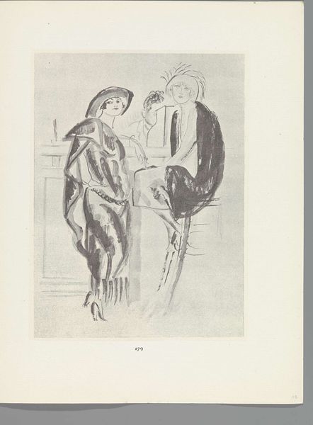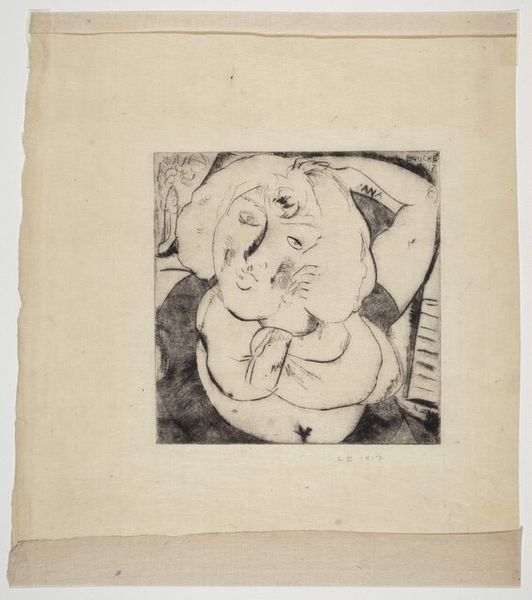 Curator: Here we have Max Beckmann's "The Duchess: Illustration for Chapter Five," housed at the Harvard Art Museums. It's an etching, measuring about 29 by 22 centimeters. Editor: My first impression is… unsettling. The distorted faces and stark lines create a really dark, almost nightmarish feel. Curator: Indeed. The composition is quite striking, with the Duchess figure looming over a smaller, almost skeletal form. Notice the density of line work; it builds form and volume, but it also obscures and complicates the reading. Editor: It’s like a commentary on power and fragility intertwined. The Duchess seems both regal and grotesque, while that tiny skeleton hints at mortality lurking beneath the surface. And is that a leopard in the background? Curator: Possibly. Beckmann often used animalistic forms and symbols to heighten the emotional intensity and explore themes of human nature. The etching medium lends itself to stark contrasts, emphasizing the emotional weight. Editor: It's a powerful, if disturbing, piece. I keep finding new details that add to the uneasy atmosphere. It really sticks with you. Curator: A testament to Beckmann's ability to render complex emotional states through a sophisticated formal vocabulary. A chilling piece, indeed.