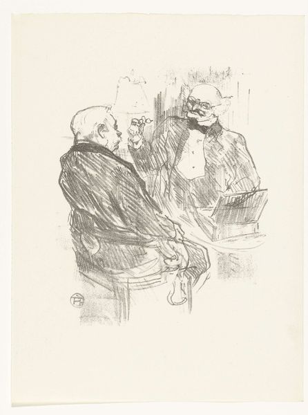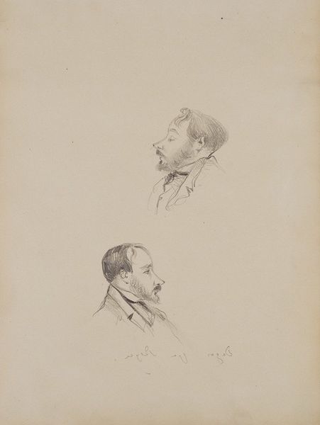 Curator: Edgar Degas rendered this pencil drawing in 1877. It's titled, “Opera Fan and Ernest Reyer.” The name alone gives us a keyhole glimpse into Parisian cultural life during the Belle Époque. Editor: It’s wonderfully evocative, though almost ghostly, with the sketchy lines barely tethering the figures to the page. Is that intended to reflect the fleeting nature of performance? The man in front with the binoculars certainly seems absorbed in something just beyond our view. Curator: Perhaps, but knowing Degas, the intention could be to depict modern leisure culture, too. Opera wasn’t just entertainment, but also a social space, a public theater of manners and power. And this is Reyer, a notable composer and critic, immortalized by his contemporary. Editor: Indeed, the act of observation seems very important here. Reyer himself likely was observing the performance or perhaps scrutinizing the audience. The other figure, partially obscured, hints at the layered social context. One could suggest he represents the collective audience. Curator: Precisely. Degas repeatedly captured these behind-the-scenes perspectives. The drawing offers us not only a portrait of Reyer but of the operagoer archetype as well, someone intimately invested in the music and spectacle. We could even argue the binoculars become a potent symbol. Editor: A symbol of bourgeois access, or even of intrusive surveillance, reflecting how performances were consumed, reviewed, and even controlled. Considering how operas shape the public mood… What hidden stories lie behind the figures who shape such grand cultural works? Curator: Well said! So this image gives viewers an occasion to delve into cultural life. Through the figures, the drawing highlights the dynamic relations between creative forces, the social spaces in which they work, and the audience. It helps us reflect on culture and power relations, visible and invisible in the artwork. Editor: A tantalizing sketch then, that sketches a world for the informed contemporary audiences of the era—while also inviting questions about access, celebrity, spectatorship for a later era of artistic experimentation.