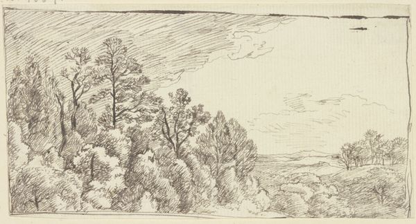 Curator: Looking at this understated sepia drawing, it seems to exude an intimate calm. The thin, dry lines offer detail but somehow enhance its tranquil impact, don't you think? Editor: It has that quaint aura of Romantic landscapes. I understand that Martinus Rørbye completed it between 1803 and 1848. He worked with ink as his medium and figuration and Biblical narrative as a loose theme to convey. However, I'm curious about his choice of ink; what sort of ink was typically used for this effect during this period and does it offer insight into this artwork? Curator: Interesting point! Knowing the precise ink could indeed reveal more about Rørbye's process. But look how this drawing, with its landscape, pulls from larger ideas about connecting national identity with representations of land. He's not simply illustrating scripture but associating it with place and with nationhood. This type of drawing had value to a developing state looking for images that resonate with culture and progress. Editor: Yes, Rørbye often worked within the established circuits, accepting patronage to create art that reinforced certain values. Yet his medium, a humble ink drawing, contradicts the grandiose oil paintings often commissioned for nation-building narratives. Do you suppose the landscape is also representative of Romantic ideas and the process of creating works of art outside establishment tastes and instead more focused on everyday life and experiences? Curator: Absolutely. Romanticism infused everything. Rørbye's contribution sits at an intriguing intersection. While adhering to convention to sustain his livelihood as an artist, he uses artmaking choices in the creative process that add unique expression and subtle details to his work that resonate far beyond that period, right up until today. It speaks to an artist making do but retaining their values within constraints. Editor: A fascinating duality indeed. He's walking a line between tradition and innovation and pushing boundaries as a maker, no doubt creating and setting trends through practice, while nodding to establishment norms, too. Curator: It's work like this that reminds me of the public role art plays in building shared histories and meanings, even through quiet, less audacious means. Editor: A reminder that value often comes not just from spectacle but from the quiet labor embedded within making, the materiality informing deeper stories of individuals and of nations.
