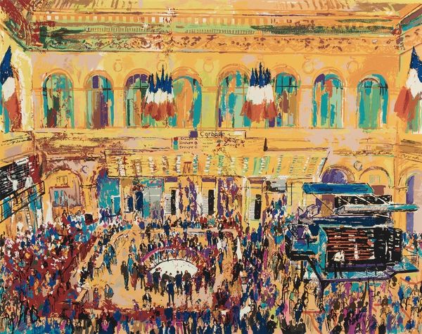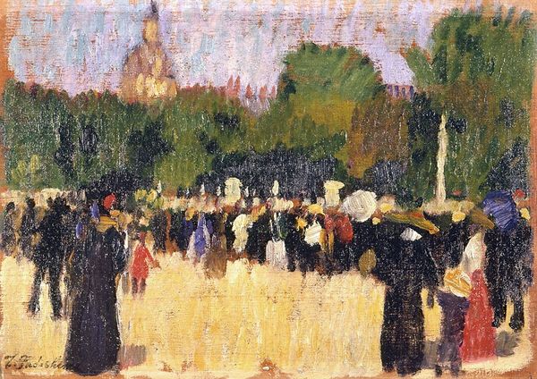 Curator: "Cour du Havre (Gare St. Lazare)" painted in 1893 by Camille Pissarro—another compelling cityscape scene done in oil. Editor: What immediately strikes me is the pulsating energy conveyed by the brushstrokes. The whole thing feels alive and in constant motion. Curator: Absolutely. Pissarro seems fascinated by modernity here, a time rapidly transforming cityscapes and the ways people navigate them. The Gare St. Lazare was not just a station, but a major portal of transformation and movement. Editor: Observe how the artist uses the materiality of the paint itself. He's built up the surface with such dense, fragmented touches. It gives the impression that everything – the architecture, the crowds – is almost dissolving into light. Curator: The station becomes a modern symbol, echoing an earlier cathedral and city gates but reflecting modern societal aspirations, movement, and accessibility. Editor: Look at how the buildings on the upper portion of the image compress the crowd—that structural technique creates dynamism and tension simultaneously. Semiotically, the repetition of figures indicates conformity of people being ushered around and told what to do; and simultaneously individualism by how each character looks distinct and alive. Curator: An intriguing paradox to reflect on—simultaneous constraint and boundless movement... That certainly seems representative of the complex emotions that came with that stage of industrialization. It presents a mirror of cultural change, doesn't it? Editor: I agree, and analyzing how he deployed color and form opens to those readings... such vibrancy of human life caught at a fleeting, crucial moment.