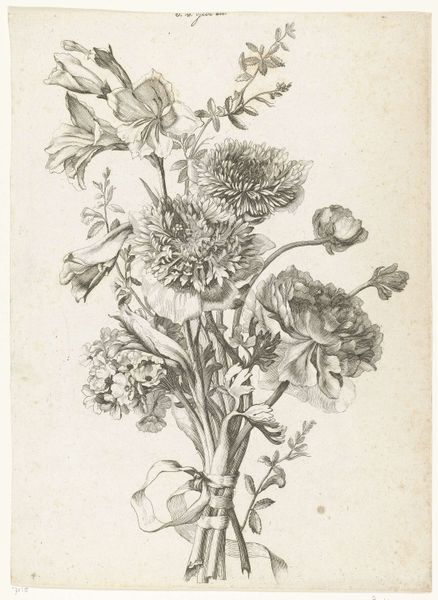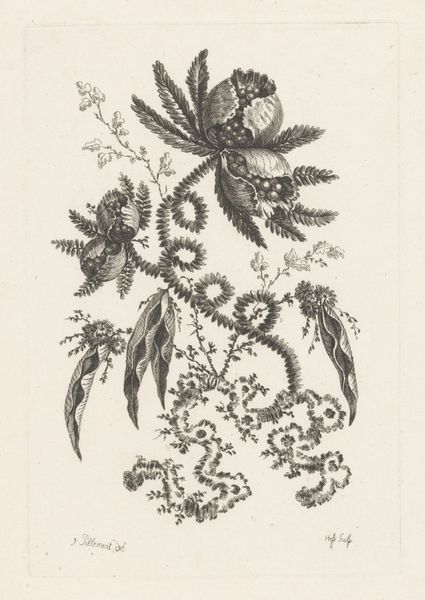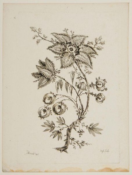 Curator: Here at the Rijksmuseum, we're looking at Johann Heinrich Hess's "Stervormige bloemen," a pen and ink drawing and etching that dates to sometime between 1755 and 1775. Editor: Ooh, delicate and sort of whimsical. It feels like a botanical illustration from a dream. Not quite right, somehow. A little bit otherworldly. Curator: Hess was known for botanical studies, but what's fascinating here is how he departs from strict representation. Note the quasi-symmetrical arrangement, and the way the leaves take on an almost geometric pattern. This work can be seen as emblematic of the period’s shifting attitudes towards natural science, engaging in a complex negotiation between empirical observation and artistic interpretation. Editor: Exactly! The so-called "flowers" near the top resemble stars, but those hanging below look a bit like onions or even planets. This reminds me of illustrations from old alchemical texts—secret knowledge rendered in plant form. The whole thing shimmers with this slightly unnerving precision. Curator: Yes, there's definitely a sense of encoded meaning. Considering the scientific and philosophical debates of the time regarding categorization and the perceived "order" of nature, one could argue Hess is questioning those very systems by blurring the lines between categories. Where does scientific documentation end and imaginative interpretation begin? Editor: Or, maybe Hess just thought it looked cool! Haha! I’m serious though, there’s a raw feeling, a spirit of creative free will in it. Even if he meant it to be more scientific, his emotions seeped in somehow. It reminds me of a passage from Hélène Cixous. Curator: An interesting thought to consider through a Cixousian lens. It prompts us to reconsider not only the act of artistic creation itself but to also delve into art historical analyses from new theoretical standpoints. Editor: Agreed. Ultimately, it makes me happy—a curious kind of happy, tinged with maybe a touch of delightful anxiety. Curator: An encapsulation, perhaps, of how the scientific revolution itself felt. Editor: Precisely! Now that's something I can reflect on later!