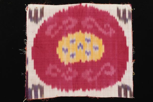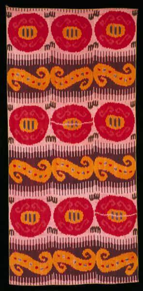 Curator: Here we have a textile panel, most likely dating to the 19th century. It’s created with weaving on silk and is an example of Asian art, currently held at the Minneapolis Institute of Art. Editor: It’s incredibly vibrant! The design featuring these large circular motifs against that off-white background really grabs the eye. The colors, those purples, yellows, and crimsons, give it such a rich, almost royal feeling. What can you tell me about the context in which this would have been made? Curator: It’s important to remember that objects like these rarely exist in a vacuum. These textiles often reflected complex trade networks and social hierarchies. It likely represents the aesthetics favored during the era, intended to be both beautiful and indicative of the owner’s status. The motifs could relate to regional symbols of prosperity or religious importance. Editor: It’s interesting to think about how the materials themselves played a role. The use of silk and complex weaving techniques suggest access to resources and skilled labor, raising questions about power and who got to participate in art creation. It makes me consider labor rights as well. The textile’s potential use is intriguing. It looks like it would’ve made beautiful clothing. Curator: Well, beyond clothing, similar panels also frequently played roles as ceremonial cloths or even displayed as indicators of wealth. Given that we see repeating forms it points to the idea of ritualistic uses that needed multiples of this object type. We do not currently know who the maker or initial intended audience was. Editor: Right, that anonymity really brings up a point. The panel also echoes other similar weavings, blurring the line between individual artistry and communal heritage, underscoring collective memory. The orientalist aesthetic makes me question the legacy of that history. How much did western appropriation or romanticization affect our view, potentially overshadowing native voices. Curator: Those concerns are entirely valid when analyzing objects within museum collections. Overall, I think these types of historical discussions add dimensions beyond simply appreciating their aesthetic features, pushing us towards deeper examinations. Editor: Exactly, engaging in historical analysis transforms our perception beyond simply beholding beautiful things. We can reveal some very useful lessons for our present moment.