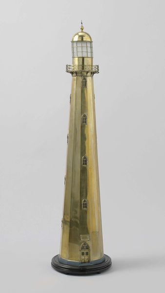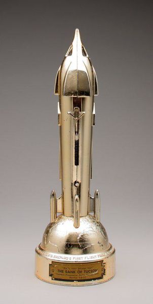 Curator: This mechanical bank, shaped like a rocket, comes to us from Duro Mold and Manufacturing Inc., circa the 1960s. You can currently find it here at the Minneapolis Institute of Art. The piece utilizes found objects and metal. Editor: Woah. So shiny! I get a sense of childlike wonder… mixed with a good dose of mid-century futurism, all wrapped in a rosy, slightly ironic glow. Curator: Its geometric style is heavily influenced by the Pop Art movement. When thinking about Pop Art we have to consider its simultaneous elevation and critique of popular culture. This period of American exuberance also existed alongside anxieties around space exploration during the Cold War, a theme that makes this sculpture all the more relevant. Editor: You nailed it. The coin slot mimics that fear and simultaneous aspiration; that tension gives it soul, a very specific…humanness, even! Curator: The piece prompts so many important questions. What does it mean that it also acts as a bank, and a symbol for saving money? It certainly implicates consumer culture and the ways the promises of modernity are packaged for American consumers. The work has layers, definitely! Editor: Exactly, right? I get the sense of banks, the final frontier, American dreams, shiny and solid… and maybe a little bit… precarious? As dreams often are. The finish makes it feel retro, you know? Like something out of The Jetsons, but slightly more sinister somehow. Curator: The "Home Savings & Loan Assoc" printed on the base also implicates questions of power. Where did the money from all these eager children investing their pennies actually end up? Editor: Oof. Right? Suddenly my shiny retro daydream gets a bit haunted. I think seeing the world, the base, squished underneath that soaring rocket gives me chills, as I guess it was supposed to do, really. Curator: By engaging with it on the levels of personal association, and wider economic questions, this simple artwork can become quite moving. Editor: Yes. I am definitely thinking about our trajectory as a culture now, the weight on our world, and maybe saving all those pennies won’t buy our way off this rock after all. Heavy. And thanks for sharing.
