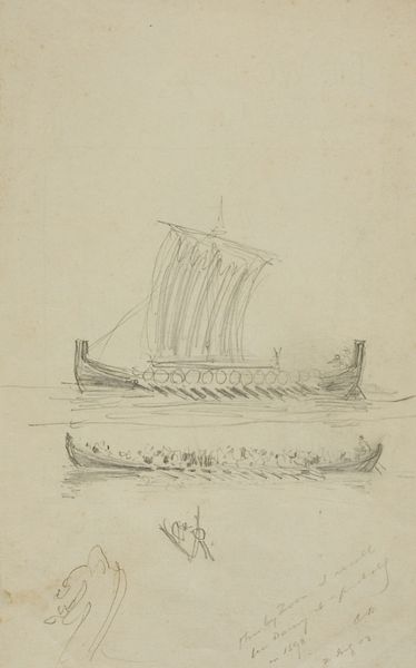 Curator: Look at this pencil drawing by C.A. Lorentzen titled "A Ship with Sails and Pennant and a Dinghy. T.v. Two Horse-drawn Carriages", estimated to have been created between 1746 and 1828. It is currently housed at the SMK, the National Gallery of Denmark. My first thought is about its lightness. Almost ethereal. The scene, composed predominantly of lines, possesses an airy and unfixed quality. What do you think? Editor: It's remarkable how much detail he captures with just a pencil. I'm immediately drawn to the contrast between the delicate linework of the ship's rigging and the heavier, almost clumsy, rendering of the horse-drawn carriages on the left. It raises questions about the materials at Lorentzen’s disposal and the economics that might privilege maritime infrastructure versus terrestrial transport. Was he a craftsman more familiar with rendering naval subjects? Curator: I see your point. Considering the time, Denmark was heavily invested in maritime trade and naval power. These images of ships served more than just aesthetic purposes. It speaks volumes of identity, Denmark’s political and economic ambitions, perhaps even how notions of Danishness were tied to the sea. Think about the laborers—from sailors to shipbuilders. Editor: Precisely. It prompts me to reflect upon the labor behind creating these vessels – the craftsmanship and sheer physical exertion embedded in their construction and maintenance, contrasting the lifestyle within those horse-drawn carriages. We also shouldn’t forget the very pencil he used, the paper it’s on and what they signified economically at that time. Curator: Yes, that comparison to labor reminds us to consider access. While the pencil drawing evokes a kind of romantic maritime ideal, it could also be about disparities in society. It underscores how resources, even experiences like travel by land or sea, were dictated by class and power structures. Editor: Absolutely. It all brings us back to the social and material reality that enabled this particular artwork to come into existence. And the context within which it circulated. Curator: Thinking about the image now, it goes beyond a mere depiction. For me, the intersection of sea, craft, class, and travel adds deeper layers of complexity that resonates today. Editor: For me it highlights the value in deconstructing the artist's decision-making process and the labor that enabled him to render a picture and what those subjects may have materially signified within the day's politics.