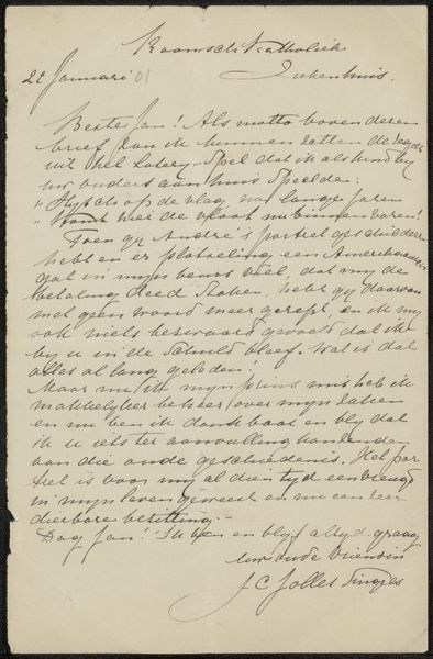 Editor: So, this is a drawing titled "Brief aan Jan Veth," potentially from 1890, created by M.C. Lebret using ink on paper. The calligraphy really stands out – it feels very personal, intimate even. What do you see in this piece, beyond just the visual? Curator: For me, this "Brief aan Jan Veth" provides a fascinating window into the cultural milieu of the late 19th century, especially when we think about the role of correspondence in intellectual exchange at the time. Letters were so important for forging communities, sharing ideas, and solidifying identities. How do you see this letter participating in those exchanges? Editor: Well, I guess it highlights how much intentionality went into communication. Today we dash off emails, but handwriting a letter, choosing the paper and ink, shows a different level of care. It makes you wonder about the relationship between Lebret and Jan Veth. Curator: Exactly. We can infer a certain level of intimacy and intellectual rapport. Also, considering the rising tide of modernism, how did such intimate exchanges, like this letter, create networks of solidarity among artists and intellectuals facing monumental shifts in artistic and social norms? The seemingly mundane object actually acted as a bulwark, did it not? Editor: That's a perspective I hadn't considered. The letter as an act of resistance, a holding-on. Curator: Precisely. And remember that each line is laden with the historical conditions of its writing, embodying specific cultural tensions and perhaps also individual or community aspirations. What did we learn looking beyond the aesthetic appeal of calligraphy into social networks that created such artefacts? Editor: I'll definitely look at letters in a different way going forward! The personal becomes political through connection and community. Curator: Indeed. The letter transforms from a simple message to a valuable witness of a historic moment.