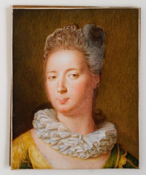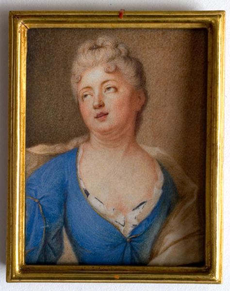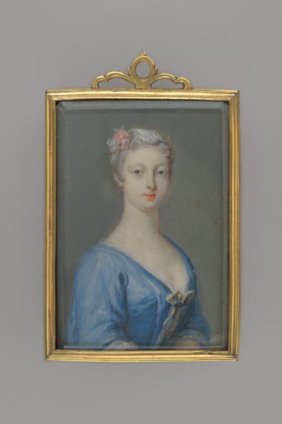 This delicate portrait, made by David Gardelle, captures a woman in the style of the 18th century. Her elegant blue dress and powder-pink hair evoke a sense of refined aristocracy. The shawl draped loosely around her shoulders points to timeless notions of modesty and grace, harkening back to classical sculptures of draped figures. Consider the colour blue: throughout history it has been associated with the Virgin Mary, royalty, and depth of emotion. Now, observe the subtle smile, a gesture that reminds us of the archaic smile on Greek statues, an expression that suggests a universal sense of harmony. It's fascinating how gestures and symbols reemerge, echoing through centuries, continuously accumulating new layers of meaning. This small portrait serves as a mirror reflecting the ongoing dialogue between past and present, continuously reinventing itself within our collective memory.