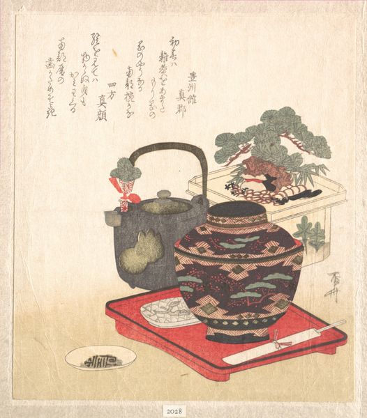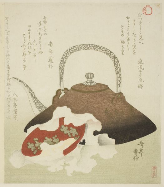 Curator: I am immediately drawn to this feeling of quietude and anticipation, almost as if something momentous is about to unfold within this intimate setting. Editor: Exactly! What we have here is Yashima Gakutei's "Wine Bottle, Cup and Cherry Blossoms" created around 1817. It resides now at The Metropolitan Museum of Art. A striking example of Japanese Ukiyo-e prints and watercolor artistry. Curator: The wine bottle certainly commands a central, almost iconic, presence. The blossoms swirling around feel almost dreamlike, hinting at something just beyond reach. It brings to mind the psychological weight of symbolic objects, here transformed by fleeting seasonal beauty. Editor: The way Gakutei arranges the bottle, cup and cherry blossoms. The stark geometry of the table setting against the fragility of the blooms strikes me as a very emotional contradiction. Curator: Indeed! We find ourselves in a landscape suffused with symbolic power. Blossoms are an important element in a work so closely entwined with transient joy and ephemeral beauty; one is made aware how deeply coded visual representation can be over time. Editor: Perhaps! But to me, the way the colors wash into each other feels as important to it’s lasting power than the individual parts. It also might indicate that there is more to it. More in line of symbolism that the flowers represent beauty. Curator: Do you imagine, perhaps, the wine itself carries meaning then? Like a portal into a deeper emotionality? Editor: It may not need to be. A glass of wine in its right is a cultural cue or bridge with others. An indication of friendship and comradery. As a stand alone artistic subject however, is less frequently viewed this way. I feel it carries a certain melancholic feel that I love and that stays with me. Curator: Such poignant observations, and I must confess that as we unpack this beautiful Ukiyo-e, its potent combination of fleeting beauty and culturally saturated symbolism certainly stays with me as well.