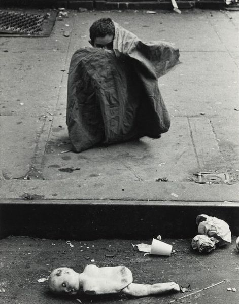 Editor: This is Paul Graham's "Untitled #38, Woman on Sidewalk, New York," from 2002. It's a photograph, and I'm immediately struck by how isolated the woman looks, almost swallowed by the harsh shadows. What do you see in this piece? Curator: It's a powerful image that speaks volumes about visibility and marginalization. The stark contrast throws light on the individual while the shadows represent systemic neglect. What does it mean to see this woman, and yet, for her to remain unseen by society? Editor: So, it's a comment on social issues, using light and shadow as metaphors? Curator: Precisely. Graham often explores the unnoticed corners of urban life, challenging us to confront uncomfortable realities about poverty, race, and representation. This invites a discussion about whose stories are told and whose are ignored. Editor: I hadn't considered the racial undertones, but that context really shifts my perspective. Curator: Art has the power to reveal these layers, encouraging us to engage critically with the world around us. Editor: That makes this piece even more impactful.