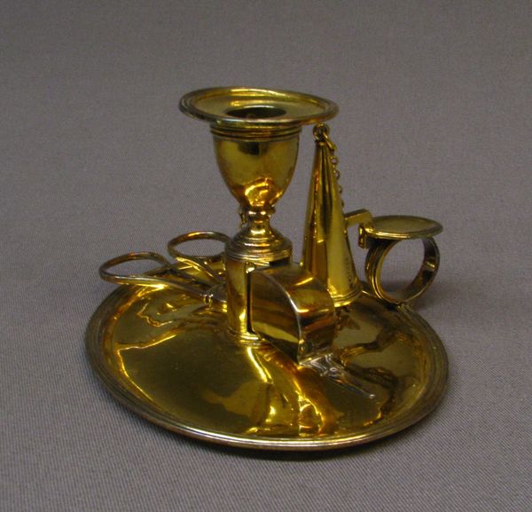 Curator: Immediately I'm struck by how austere and elegant this chamber candlestick looks; so classical, almost cold in its perfection. Editor: I see the austerity, certainly, but for me it speaks more to the social inequalities of the time, think about who would've commissioned such a thing. Let's set the scene here: this is a silver chamber candlestick crafted between 1802 and 1803, created by John Emes. It's currently housed at the Metropolitan Museum of Art. Curator: Emes was clearly working within a Neoclassical framework. The clean lines, the geometric forms. Silver as a medium inherently evokes the moon, doesn’t it? That cool, rational light of the Enlightenment seems almost physically manifested here. Notice the deliberate symbolism in its proportions. Editor: Absolutely, it's visually aligned with the aesthetics of power that Neoclassicism represented; remember the era and the social hierarchies it perpetuated! Though, the domestic setting adds an interesting dimension. It's about control, order, the 'civilizing' influence of wealth displayed even in something as commonplace as a candlestick. How might owning something this luxurious affected social identity? Curator: Ah, that's precisely the magic! The candlestick isn't *just* about wealth or dominance. Light and shadow, those age-old symbols. Candlesticks guide you through the darkness and they are also associated with ancient rituals, storytelling. Editor: So you see this less as a declaration of power and more as a comfort? I am interested to learn your interpretation given that the 'holder' for moving it from room to room appears much like an exaggerated finger-ring! I imagine it served a more specific purpose tied to the mobility and ritual, for a specific individual, of light during that era, but for whom? What would the artist have thought? Curator: Exactly! Light has guided people, for thousands of years. A well-made candlestick became more than an object; it resonated in one's imagination like some symbol. This candlestick whispers stories and cultural meanings embedded in silver for years to come. Editor: And these stories of light, like those told today with our tech devices and media, have continued through generations, each generation altering our social conditions along the way, and our ways to navigate literal, symbolic, and virtual forms of the dark. Curator: Beautifully said. That little piece of reflective metal, just like cultural objects, holds stories. Editor: Right! Here’s a question: who gets to craft narratives? In Emes’s time, this candlestick amplified those that reflected their socio-political and spiritual priorities. Whose lights do we follow today, and who's carrying the candle now?
