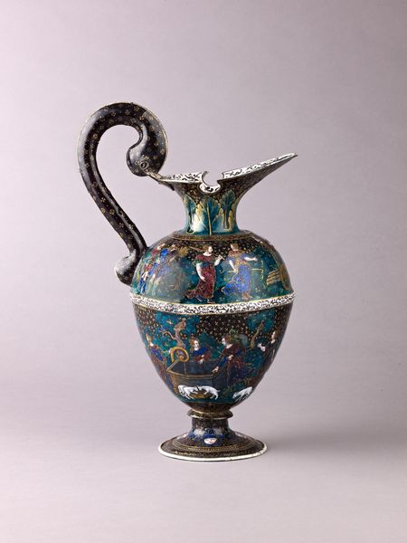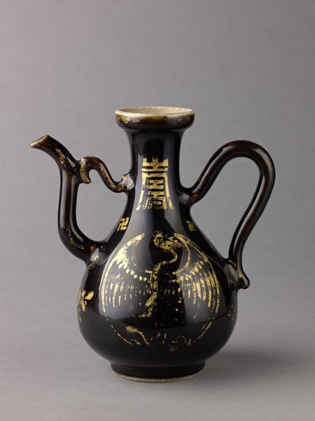 Curator: Looking at this Tang dynasty "Phoenix-head ewer," a particular sense of refined opulence comes to mind, even before one delves into the historical implications. The tri-color glaze, sancai, strikes me as exceptionally sophisticated. Editor: Yes, it certainly has an imposing yet graceful presence. The contrast of the dark blue and amber against the neutral background is quite striking, imbuing the vessel with a somber grandeur, and there is an obvious refinement in form. Given that it dates back to sometime between 671 to 749, what does the presence of such an artifact reveal about the period’s socio-cultural dimensions? Curator: As a cultural object, its craftsmanship embodies the Tang Dynasty’s cosmopolitan character and its extensive trade routes that fostered interactions between Chinese, Persian, and Central Asian cultures. This explains why objects in Sancai were a reflection of China’s rise as a dominant economic power. Editor: True, but if one takes it out of this setting and looks at its formal aspects: consider how the ewer has an amalgamation of different forms, like the body resembling the body of a gourd. How would you see such play with form and its impact in our reading of this object? Curator: That observation is incisive. By fragmenting and synthesizing new forms from established ones, like gourds or mythical figures, a distinct visual lexicon emerges, in a system which allows the viewer to re-examine fundamental artistic assumptions while appreciating traditional motifs, a crucial attribute for the Tang dynasty ceramics in establishing aesthetic language. Editor: Absolutely, I see what you mean; such fusion underscores the intellectual complexity in these types of ceramics. I am always deeply intrigued by the convergence of visual dynamics and the historical implications that it reflects, adding rich layers of understanding about our artistic and societal foundations. Curator: Well, on balance, analyzing it through different approaches provides a more detailed reading of not just how well such an object might exemplify different forms of material and artistic advancement but, importantly, how those visual properties in turn contribute to constructing historical awareness.