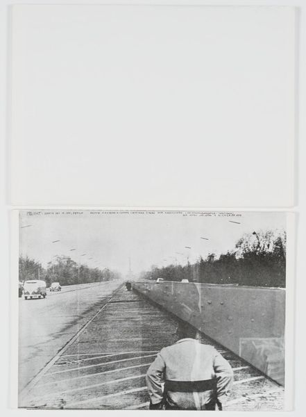 Editor: This is "U.S. 285, New Mexico," a 1955 gelatin silver print by Robert Frank. I find the stark simplicity quite striking, especially the way the road's lines lead into the vast, undefined space. What do you see in this piece? Curator: Initially, the powerful use of line dominates; the converging perspective draws the eye relentlessly into the composition. The stark contrast between the pavement and the surrounding landscape also creates a visual tension, reinforcing the idea of movement but also confinement. Observe how Frank utilizes the textural qualities inherent in the gelatin silver process. Editor: Confinement? That's interesting, I saw the road more as an invitation. Curator: While I appreciate your interpretation of invitation, I consider how Frank may also subtly be hinting at the limitations, the almost oppressive uniformity, of modern American life through its rigid, almost geometrical form. What is the impact of the high contrast and restricted tonal range on the meaning for you? Editor: I guess the high contrast and the greyscale create a sense of bleakness, maybe that contributes to what you called "confinement." How does Frank use photographic techniques here? Curator: Precisely! The directness of Frank’s approach, a rejection of pictorialism, allows for an unvarnished view. The slightly tilted horizon and somewhat grainy texture emphasize its stark reality. Furthermore, the strong linear composition guides your eyes, and then ultimately denies any specific focal point. What could that imply? Editor: That we are left without an easy answer. This really is a photograph that shows so much in what is apparently so little! Curator: Precisely. Thinking about it this way provides an enriching avenue for considering formal structures.