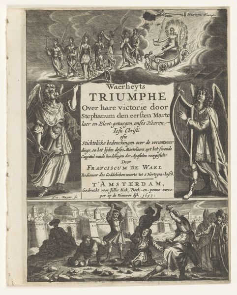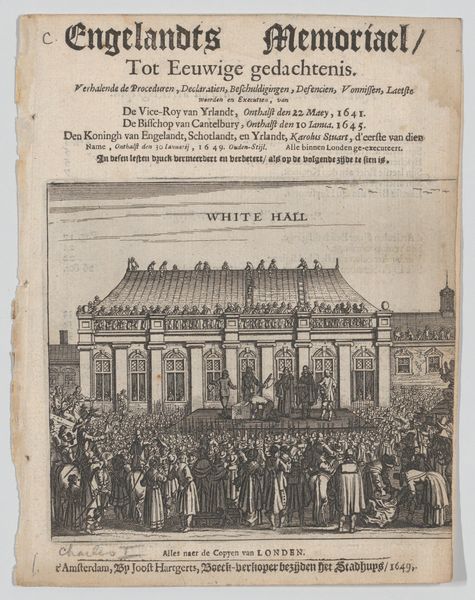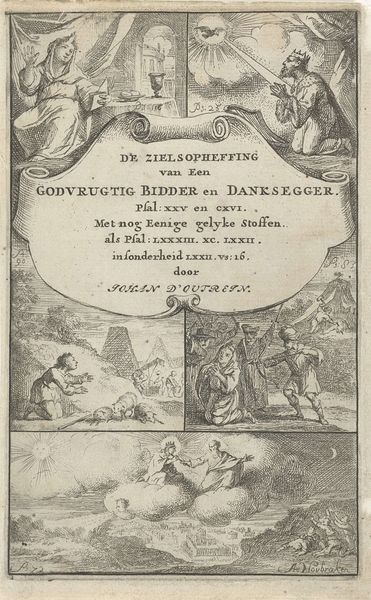 J.H. Rawert created this print, "En offerscene," using engraving techniques. The print immediately draws you in with its stark contrasts and formal arrangement. The composition is divided into distinct zones: the upper section presents ornate typography, and the lower section offers a meticulously detailed scene. The image plane is organized into a central space showing a formal ritual, drawing the eye through the symmetry and balance. We can appreciate the dynamic interplay between text and image, indicative of the period's approach to disseminating knowledge. The semiotic structure is evident, with the depicted scene symbolizing historical narratives and cultural values. The use of light and shadow not only defines forms but also imbues the image with a sense of drama. This reflects broader philosophical concerns about representation and the construction of historical narratives. The print challenges fixed meanings, inviting a deeper look into how such imagery functioned within the political and intellectual contexts of its time.