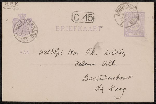 This is a briefkaart, or postcard, sent by the Dutch artist Jac van Looij to Jan Veth, likely in 1889. It offers a glimpse into the social and professional networks of artists in the Netherlands at the close of the 19th century. Postcards like this served as a convenient form of communication, facilitating the exchange of ideas and news within artistic circles. The postal markings reveal the journey of this particular card, from Bussum to Amsterdam, documenting the institutional infrastructure that supported artistic communities. Consider the significance of correspondence in a pre-digital era. These cards served as vital links between individuals, shaping artistic discourse and fostering a sense of community. Further research into the correspondence of Jac van Looij and Jan Veth may reveal insights into their artistic practices and the broader cultural landscape of the time. By studying these exchanges, we can better understand the social conditions that shaped artistic production and reception.