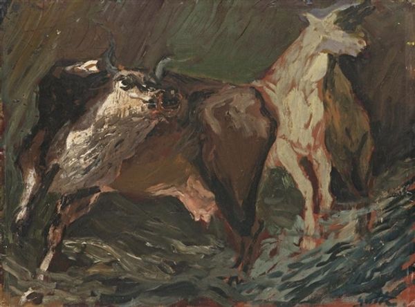 This is Franz Marc’s, Small Horse Study, painted with oil on paper around 1905. At first glance, the composition is dominated by strokes of brown and beige. These hues blend to create a sense of warmth, while the texture feels raw and immediate. Marc captures the essence of the horse, its form emerging from the energetic application of paint. The brushstrokes aren’t just descriptive; they’re expressive. We see Marc’s interest in conveying the animal's vitality through abstraction. Instead of precise anatomical detail, he emphasizes the horse’s powerful build and posture. This study serves as a visual metaphor. Marc sought to depict the inner life of animals. His work reflects a desire to find a deeper connection with the natural world and to represent a reality beyond mere surface appearances. In this Small Horse Study, it's the vibrant materiality and form that truly speak.