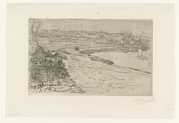 Herman Boulenger created this etching of the port of Antwerp in 1891. The composition is immediately striking for its panoramic breadth, offering a sweeping view across the water. The artist uses a delicate balance of light and shadow, created through fine, closely-knit lines, to convey the atmospheric depth of the scene. Boulenger masterfully employs line and form to guide the viewer's eye, creating a semiotic system of signs. Notice how the contrast between the solid structures on the horizon and the fluid water destabilizes the conventional static/dynamic dichotomy. This contrast not only animates the scene but also challenges fixed notions of stability. The linear precision and careful arrangement of elements within this etching function as more than mere aesthetic choices. They serve to engage the viewer in a dialogue about the nature of representation and the shifting boundaries between the real and the perceived.