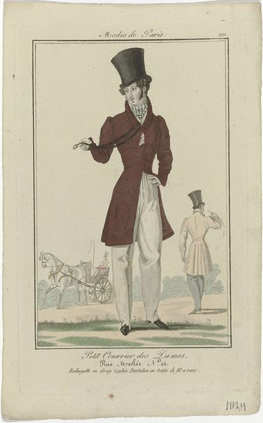 Curator: Looking at this piece, I immediately feel transported to a world obsessed with presentation. The overall impression is one of careful composure and constructed identity. Editor: Indeed. This is a page from *Petit Courrier des Dames*, specifically issue number 704 from February 25th, 1830. It’s an engraving with watercolor, a style that exemplifies the romantic sensibilities of the era and, more importantly, a moment in the rapidly changing fashion of Parisian men. Curator: The main figure’s gesture, the raised hand, it feels almost performative. Is he inviting us into his world of style, or merely displaying it? It reminds me of images used today that broadcast carefully curated online personas. Editor: Perhaps it is both! The engraving meticulously details his attire: the “Chapeau Napolitain” referenced in the title, the velvet cravat, and the gros de Naples waistcoat. These weren't just garments; they were signifiers of status and belonging in the burgeoning culture of Parisian modernity. The full title is longer: *Petit Courrier des Dames, 25 février 1830, No. 704: Chapeau Napolitain, Cravate en Velours, Gilet en gros de Naples, Redingote.* Curator: I find the other figure on horseback fascinating, fading into the background. What cultural continuity can we glean from the obscured rider and prominent main figure? Editor: The inclusion of the rider in the background subtly reinforces a particular vision of idealized masculinity as well as alluding to traditional forms of aristocratic presentation in contrast with the city gent, whose focus is an urban experience. This illustration served as a tool that was trying to democratize a particular mode of upper-class presentation, while reinforcing class structures. The fashion industry's early methods aimed to trickle down from elites, all within the setting of Romantic Paris, with both figures taking to the street in similar sartorial display. Curator: Considering our era of street-style blogs and influencers, the image highlights a remarkable persistence in the human drive to signify through dress, adapting it over time as forms and social relations evolve. Editor: Agreed. Looking at this work from the Rijksmuseum, it acts as an ancestor, documenting this very human performance, and it shows us the power of image making in visualizing cultural status then and today.