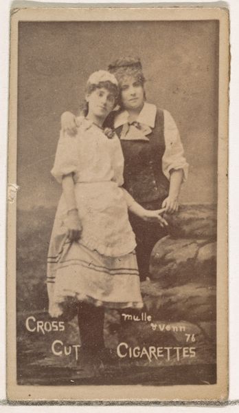Curator: At first glance, I am struck by the tonal range and its compositional complexity—primarily creams and browns forming soft but dynamic diagonals and layered surfaces. Editor: And how wonderfully ordinary this object is! This is “Chappele Sisters,” a photograph printed as a cigarette card by Goodwin & Company, dating from around 1886 to 1890. It's currently part of the Metropolitan Museum's collection. Curator: Ordinary in what way? I see in its geometry and figure/ground relationships a fascinating interplay—notice the slight tension in their contrasting body language and gaze. This asymmetry animates what could have been a static image. Editor: It's an advertisement, of course! Imagine collecting these cards—with actresses and actors as the subject—distributed in cigarette packs. The very act of its consumption embedded in a growing consumer culture signals modernity. But the ‘ordinariness’ also extends to the ambiguous representation of gender identity and performance. These were, in fact, popular postcards to be shared amongst a burgeoning gay community. Curator: I’m intrigued by your observation on the role of societal consumption in art appreciation, and I do see what you mean. Returning to purely formal terms, though, the layering creates depth in the picture. The placement of the figures, and the tonal gradations—highlights here, shadows there—make this miniature come to life. Editor: The formal elements you speak of do capture aspects of the social dynamics as well. These theatrical and ambiguous gender expressions played a role in shaping self-expression for diverse individuals, challenging normative assumptions of beauty, desire, and celebrity. Curator: It's remarkable how much we can both glean from a work that is physically so modest. Looking closely always has its rewards. Editor: Yes, an unexpectedly rich tapestry of cultural narratives are woven into these compact forms. The humble cigarette card becomes an icon for historical study, demonstrating a cultural artifact's place in constructing communities and identity.