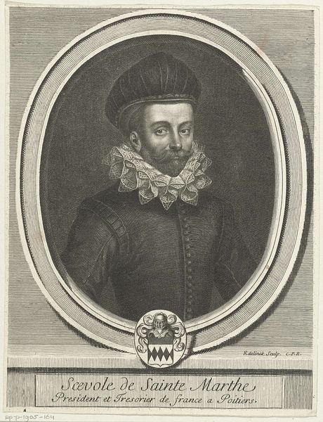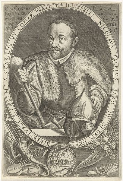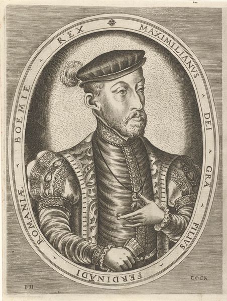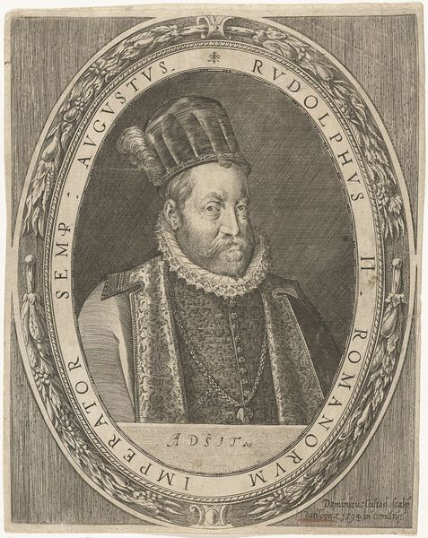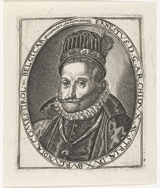 Curator: Looking at this engraving, titled "Portret van Filips II, koning van Spanje," we see Philip II, King of Spain. It’s estimated to be from between the 1590s and early 1600s and is attributed to Lambert Cornelisz. Editor: It strikes me as immediately austere, almost grim. The stark contrasts emphasize the gravity of his expression. Is it the typical ruler portrait, all power and presence? Curator: In some ways, yes, but there’s more to it than that. Consider the intricate detail, despite its relatively small scale, achieved through engraving. This was, after all, a man who projected an image of pious strength. Engravings like these were crucial for disseminating the image of the monarch, to propagate the symbolism of leadership and divine right, which was incredibly important at that time. The oval frame is a symbolic enclosure, representing authority. Editor: I see it more as reinforcing distance. Look at the layers of clothing, the high collar, the hat—each an item marking status, creating visible barriers. He looks trapped by his position. Especially when you understand the brutal legacy of colonization linked to his reign, you can interpret that trapped feeling as, perhaps, karmic. Curator: But think about the conscious messaging through visual symbolism! The inscription surrounding him acts almost like a halo. The details are incredible considering it is just ink and paper, so many details like the lines on his face and hair show us how strategic this must have been for how his image was perceived! Editor: Yes, engravings amplified reach, but at what cost? Representing figures of authority at the expense of the oppressed carries lasting repercussions, visually reinforcing the narratives we must continuously critique and resist. The meticulous detail doesn't erase history, it highlights whose stories were considered worth preserving and disseminating. Curator: It's true that images like this are powerful tools of propaganda, but as a historian I’m also interested in how we look back and re-interpret those visual cues, those messages. Editor: Absolutely. Art enables that continuous reassessment, prompting dialogue between then and now. That's why pieces like this aren’t just artifacts; they’re ongoing conversations.