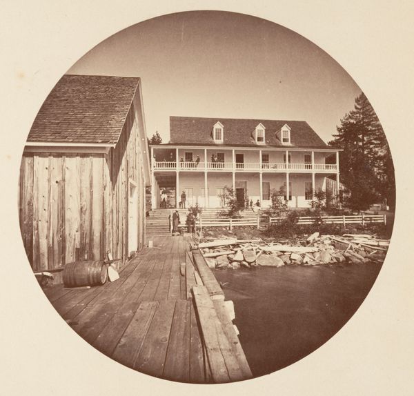 Curator: What strikes me immediately about this George Kendall Warren photograph, titled "Botanical Garden (with posed figure)," is its almost ghostly quality. It's framed in this perfect oval, like a memory pressed between the pages of a very old book. Editor: Yes, the oval format lends it an antiquated charm, doesn't it? Ovals often symbolize protection or enclosure, echoing the garden itself. It's a visual representation of cultivated nature, set apart. Curator: Right! And within that oval, you have the almost ethereal greenhouse, promising growth and warmth. A figure stands beside it, perhaps a keeper of this enclosed Eden. I wonder if they knew how much this image would capture the imagination. Editor: The figure certainly adds a human element, suggesting scale and purpose. Greenhouses are temples of growth, aren’t they? Sheltering life, forcing it into existence outside of its natural rhythm. The photograph makes me consider human dominion over nature. Curator: It's a gentle dominion here, I think. The image feels more like a quiet observation, a collaboration even. Editor: Perhaps. All I know is I'm suddenly in the mood for a cup of tea in a glasshouse.