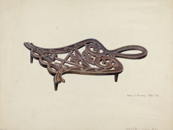 This is Amos C. Brinton’s ‘Bootjack’, a drawing made with, what looks like, graphite and watercolor on paper. It’s cool how he’s used a limited palette of warm browns, almost like sepia tones, to create a sense of depth and dimension, right? The surface has this smooth, almost matte finish, which makes you wonder about the paper he chose. There are so many lovely details, for example, the way the light catches on the curved edges of the metal, casting soft shadows, or how the artist carefully rendered the openwork design. This level of detail reminds me of some of the early American folk artists like Joseph Warren Lehn. The Bootjack’s simple, utilitarian beauty is something to admire, and like all good art, it gives us permission to find our own way into the image, leaving room for ambiguity and interpretation.