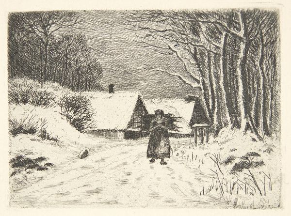 Ronau William Woiceske created "Winter Chores" using drypoint to depict a snow-covered homestead. Woiceske, working during the first half of the 20th century, captured scenes of American life that often highlighted rural or working-class experiences. There is a starkness to the composition, a sense of the isolation and the relentless work that defined many lives in the pre-war years. We might consider how this image resonates with ideas of masculinity and labor. The figure is caught in the midst of his daily tasks, his back turned as he goes to fetch water, his figure suggesting a certain stoicism. What kind of emotional landscape does this generate for you? It seems to me that Woiceske asks us to contemplate the relationship between humans and the environment, and the ways in which our lives are shaped by both. The image invites a dialogue about the dignity of labor, and the quiet perseverance required to face the challenges of everyday life.