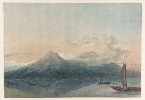 Editor: Here we have Alexander Cozens’ "A Bay with a Ship, Coast to Right," a watercolor monotype at the Tate. It's, well, brown! A very tonal, dreamlike scene. What captures your eye most about this piece? Curator: It feels like a half-remembered dream, doesn't it? Cozens was all about evoking a mood, like a visual poem. I get a sense of vastness despite its small size, almost infinite potential. Look at how he suggests form with so few strokes. Does it make you feel a little lost, in a good way? Editor: Lost, yes, definitely! I hadn't thought of it like a poem, more like a... fading photograph. Curator: Exactly! And that's the beauty, isn't it? It's both. Art is all about seeing what you see.