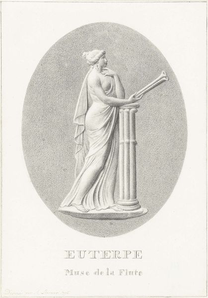 Editor: This is Alexander Liernur's 1796 pencil drawing of Terpsichore, the muse of dance. It feels almost like a classical sculpture, even though it’s a drawing. What do you see in this piece? Curator: I see a careful meditation on the social currency of antiquity during the late 18th century. This isn't just a simple illustration; the choice of pencil, mimicking the texture of marble, and the very deliberate staging—Terpsichore perched on a rough-hewn block, seemingly hewn from a quarry, playing her lyre—speaks to a fascination with the means of production. It almost romanticizes the labor, doesn't it? Editor: It does! Like a perfect moment captured right at the source. It also strikes me as an allusion to high culture. Curator: Exactly! Liernur challenges the viewers. Is it a high art sculpture, a humble drawing, or a representation of the value attributed to classicism? I'm curious, what kind of labor went into the materials used in the artwork, from pencil production, to the types of papers available, how this access determined artistic license and consumption of art at this time. Editor: That's a side of art I hadn’t considered before—the kind of resources and industries necessary to create art and how the production of art in this time differed across places and status. I now see that drawing is more than just a drawing. Curator: Absolutely, we need to be inquisitive about the means of making the art, who did it, what was made from and its consumption in a larger social context. What was considered ‘art’ in comparison to craft, and how the perception of this affects today's artistic judgment.