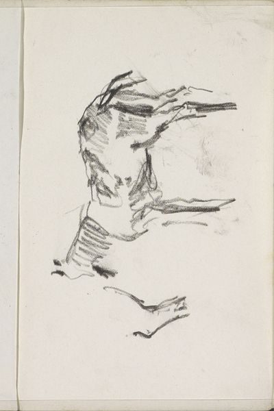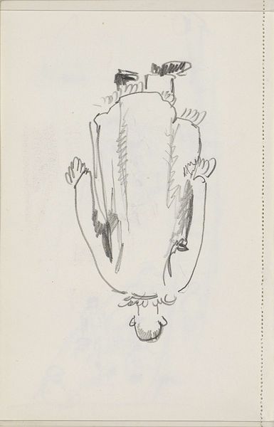 Curator: Looking at "Twee trekpaarden," or "Two Draft Horses," a pencil drawing by Cornelis Vreedenburgh, likely created sometime between 1890 and 1946, here at the Rijksmuseum. What strikes you first? Editor: The sketch is quite gestural. Raw, even. The hurried application of pencil strokes and the emphasis on capturing the essence of form over photographic precision. Curator: Exactly. Draft horses, historically beasts of burden, here rendered with quick strokes suggesting movement and powerful build. It captures the essence of their working existence. In much of Western iconography, horses symbolize nobility, vigor, but this work speaks more to their role in agriculture. Editor: The use of line is interesting. It isn't descriptive in a traditional sense, but conveys weight and musculature with economy. And the cropping - it cuts off portions of the horses, making them monumental and implying they extend beyond our view, imbuing them with significance. Curator: Consider how, even unfinished, the overlapping of the horses and the use of chiaroscuro give them depth, connecting them to traditions of realistic representation—a type of realism where emotional and symbolic meaning matter more than objective accuracy. The implied weight is a visual metaphor, I believe, for a working-class ethic: burden, but also dignity. Editor: It’s compelling to observe Vreedenburgh stripping away extraneous detail, focusing instead on the barest formal elements to reveal something truthful about labor and the natural world. A deconstruction that lays bare an unsentimental observation. Curator: It seems to bypass idealism entirely. The rough sketch quality almost conveys their weariness, don’t you think? It resists romanticism, nodding instead towards a stark reality of reliance and co-dependence. Editor: The deliberate simplicity allows us to observe the elemental structures; a foundation for our own layered interpretations. Its pared-down essence becomes surprisingly resonant. Curator: An eloquent portrayal with a mere pencil. Editor: Succinctly put.
